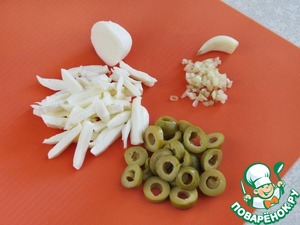 Моцареллу нарезаем соломкой, оливки кружаликами, оставшийся зубчик чеснока измельчаем.