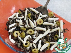 Затем остывший рис смешиваем с моцареллой, оливками, чесноком и заправляем оливковым маслом (я заправила ароматным маслом от вяленых помидорок черри. Благодаря быстрому рецепту Оленьки Бабич, у меня теперь всегда есть вяленые помидоры!). Солим, перчим по вкусу.