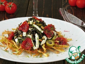 Далее выкладываем всё на блюдо. Сначала картофель-пай, затем горкой рисовый микс. Сверху выкладываем вяленые помидоры, посыпаем кедровыми орешками и зеленью.