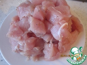 Филе индейки вымыть, обсушить, нарезать кусочками.