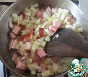 Лук и чеснок очистить и порубить. Бекон нарезать кубиками. В кастрюле с толстым дном нагреть 1 ст. л. оливкового масла и обжарить лук с беконом до полу прозрачности лука. Добавить чеснок.