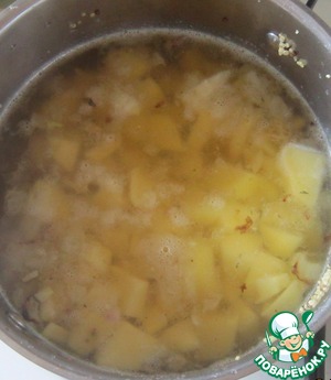 Если в ваших магазинах водится такой зверь, как "батат", смело используйте его - получите аутентичный суп. Я же взяла родную картошечку, очистила, нарезала кубиками и добавила в кастрюлю.