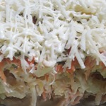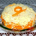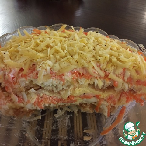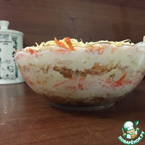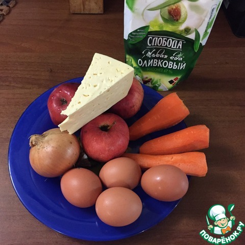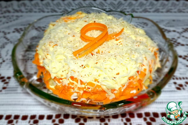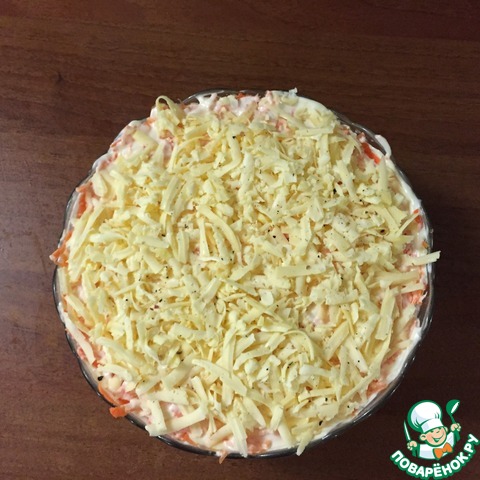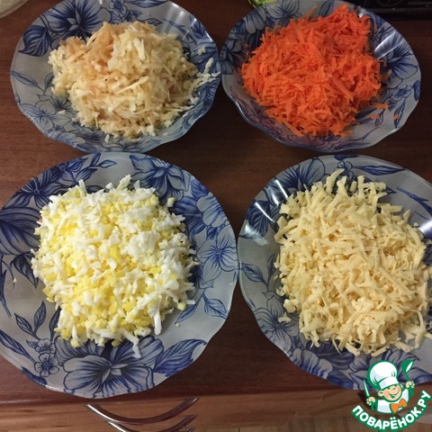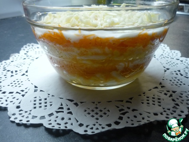 Выложить слоями: лук, яблоко, яйцо, морковь, сыр, и также по второму кругу. Каждый слой посолить, поперчить, смазать майонезом, кроме верхнего сыра. На 15 мин в холодильник.