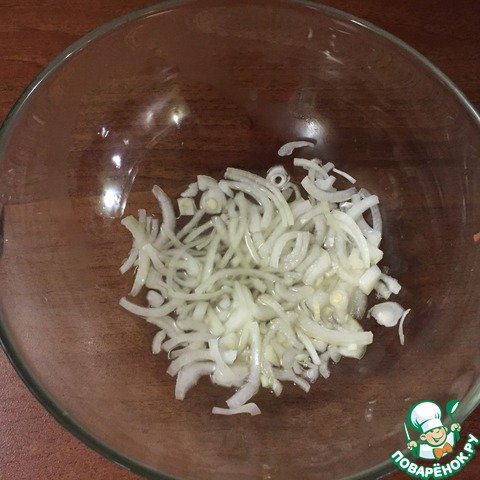 1/2 луковицы порезать полукольцами и обдать кипятком