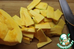 Обработанную тыкву нарезаю тоненькими/тонюсенькими пластинками.
