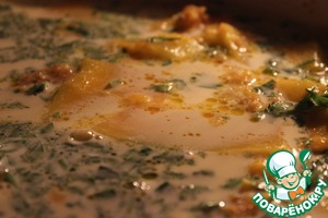 Параллельно готовлю "болтушку" из яиц, сливок, сахара, соли, измельченной зелени петрушки и масла можжевельника.