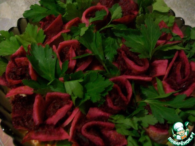 11. Выкладываем розочки из блинчиков на салат верхним слоем. Добавляем веточки петрушки. Салатик готов! Приятного аппетита!