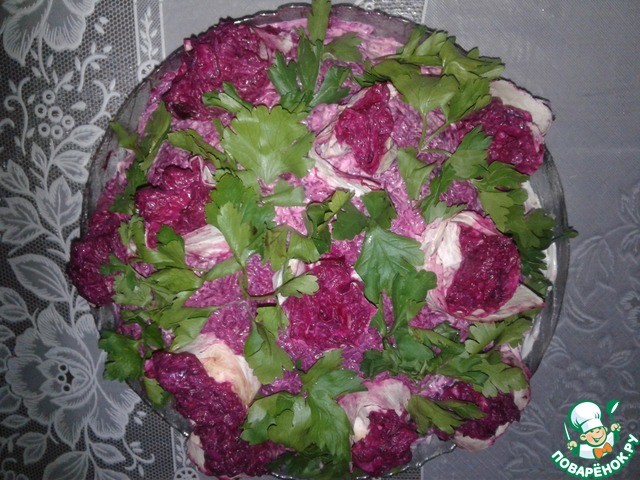 В основе салата лежит традиционная "сельдь под шубой". Вот так можно преподнести всеми любимый салат на праздничный стол.