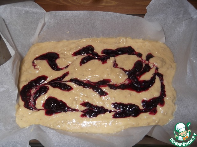 Тесто выкладываем в форму. А сверху ложкой понемногу выкладываем варенье (я варенье беру кисленькое). После этого ножом делаем разводы.