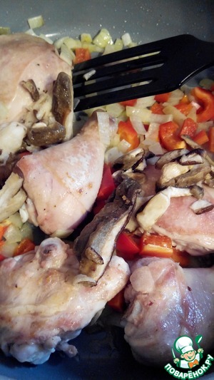 • На раскаленном растительном масле обжарить до золотистого цвета курочку, нарезанную на порционные кусочки. Посолить.