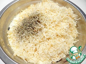 К остывшему рису добавляю натертый копченый сыр, сметану, взбитую с яйцами, прованские травы. Соль я не добавляю, так как сыр содержит достаточное её количество.