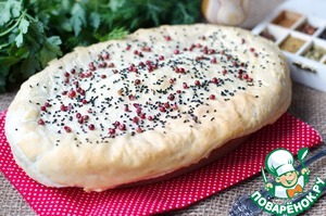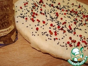 Накрыть тестом форму с рисом, сверху можно посыпать кунжутом, у меня розовый перец и семена нигеллы.. Выпекать 20 мин при температуре 180 градусов в духовке..