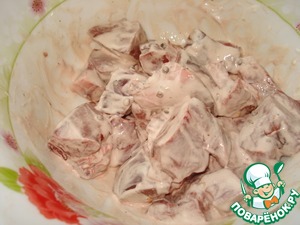 Сначала надо замариновать субпродукт -сердце. Его хорошо промываем, нарезаем на небольшие кусочки. Добавляем йогурт, имбирь порошок, чили, зиру, кориандр, соль.