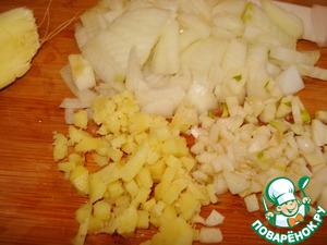 Лук репчатый, чеснок, корень имбиря (примерно 2 см) измельчим.