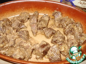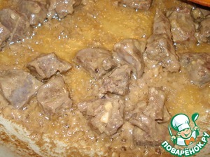 Добавим кусочки замаринованного сердца. Обжарим, помешивая, в течении 5 минут, потом добавим 150 мл воды и потушим под крышкой минут 20.