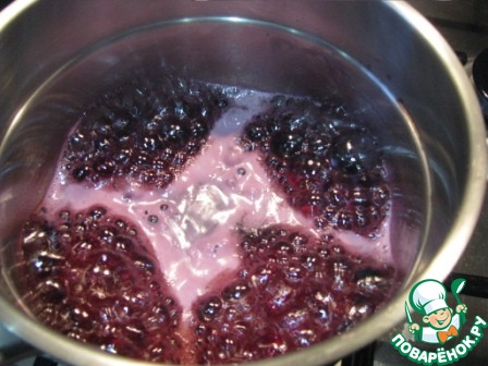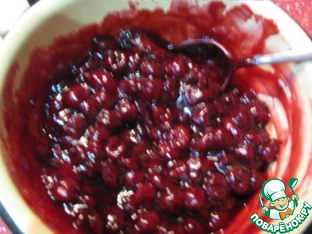 Для приготовления начинки: отделяем ягоды от жидкости. Добавляем в ягоды 100 г. сахара, размешиваем и доводим до кипения, тонкой струйкой вливаем разведенный крахмал 2 ст. л на 6 ст. л вишневой жидкости, и варим до загустения.