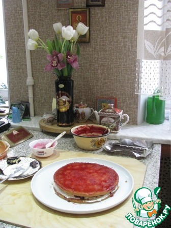 Готовые бисквитные коржи: каждый корж смачиваем вишневым сиропом