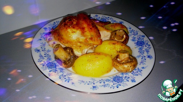 • Вот такая румяная курочка получилась. Хрустящая кожица, ароматная картошечка и невероятно вкусные грибочки.