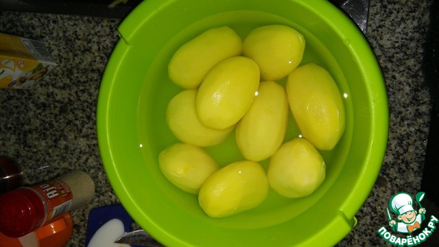 • Очистим картофель, помоем и разрежем вдоль на 2 части.