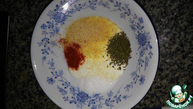 • Наливаем сливки (примерно 50 мл), добавляем паприку, соль, перец, сушеный чеснок (у меня петрушка и чеснок были сушеные, но вполне подойдут и свежие, просто тогда их нужно сильно измельчить) и петрушку. Все тщательно перемешиваем. Это наш соус для картофеля и курицы, которым мы их смажем перед готовкой.