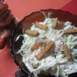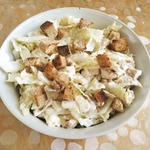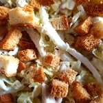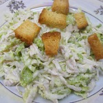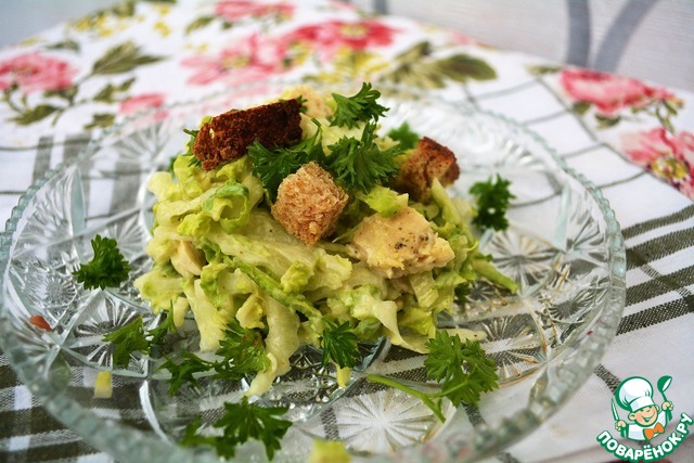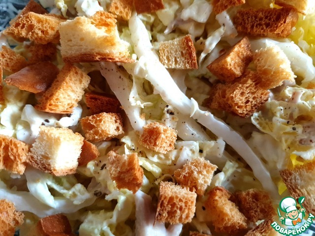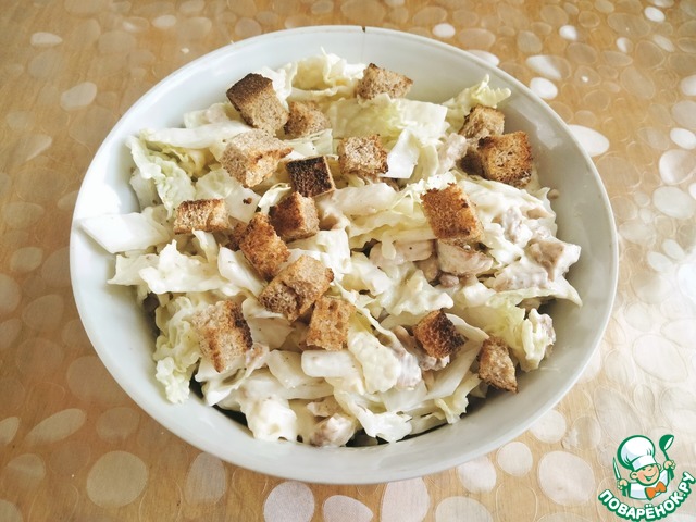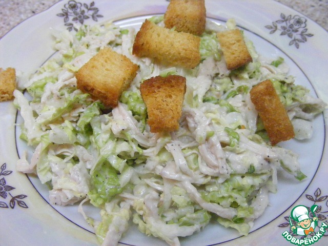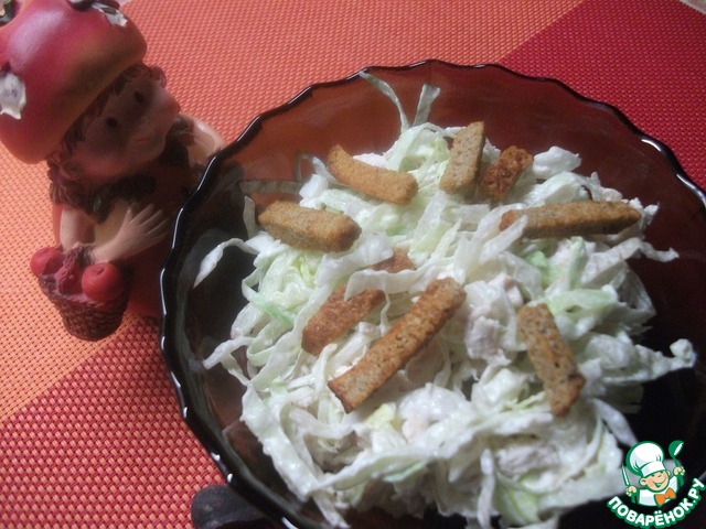 Перемешать куриное филе с капустой, добавить немного майонеза, перемешать. Перед подачей на стол посыпать сухариками.