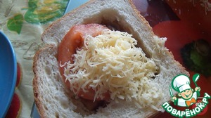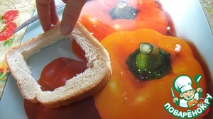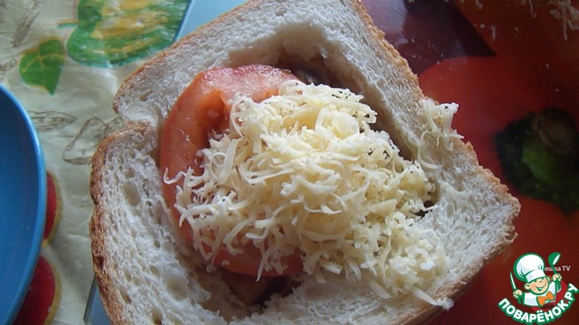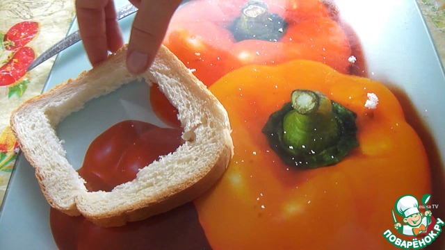 2. В двух из трех кусочков хлеба вырезаем мякиш внутри. Нарезаем помидор кольцами.