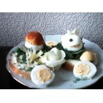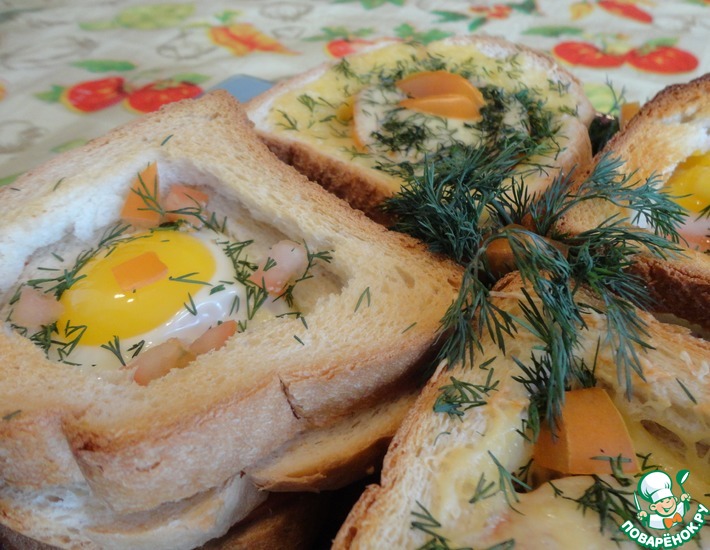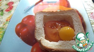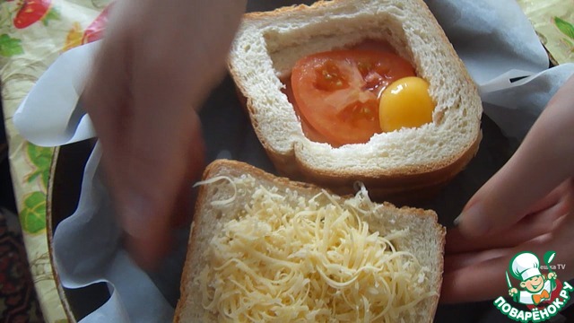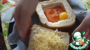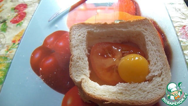 3. Далее на целый кусочек хлеба выкладываем колбасу. Сверху накрываем кусочком хлеба без мякиша, внутрь которого кладем помидор. Добавляем еще один кусочек хлеба без середины и вбиваем внутрь яйцо.
