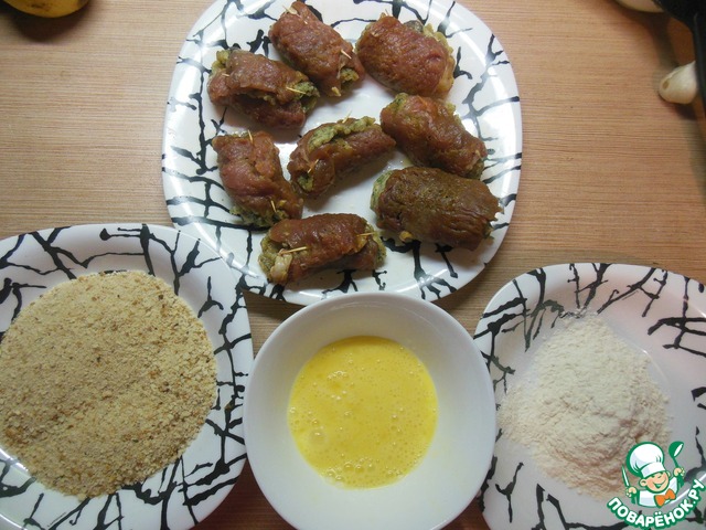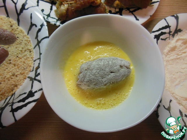 Наш рулетик обвалять в муке, затем в яйце.
