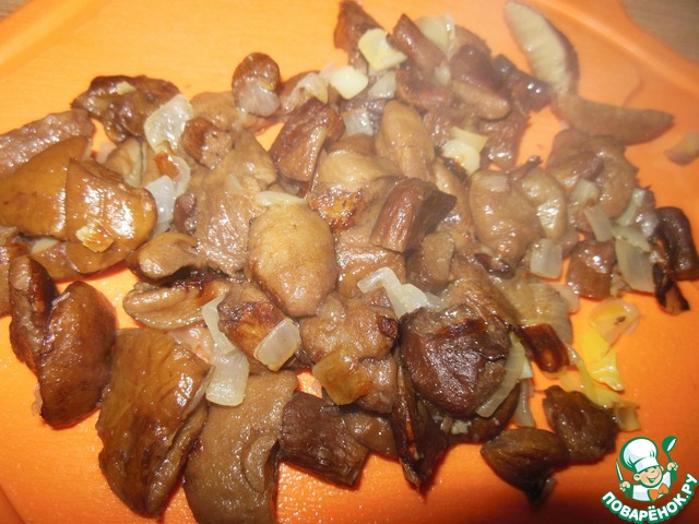 Грибы (у меня белые, но можно и шампиньоны) пожарить с луком. Нарезать небольшими кусочками.