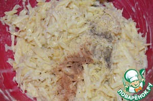 Картофель и репчатый лук почистить, натереть на крупной тёрке. Добавить крахмал, яйцо и перемешать.