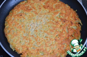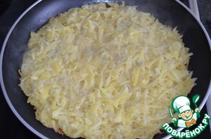 Сковороду (28 см диаметром) нагреть с подсолнечным маслом, выложить картофельную массу и жарить на среднем огне до золотой корочки (если требуется, то под крышкой).