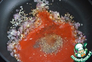 Обжарить на сковороде нарезанный лук с чесноком, добавить пассерованные томаты, орегано, соль, сахар и перец, всё хорошо перемешать.
