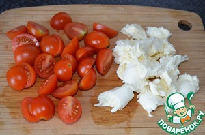 Выложить сверху начинку из помидоров, тунца (сок слить) и моцареллы.