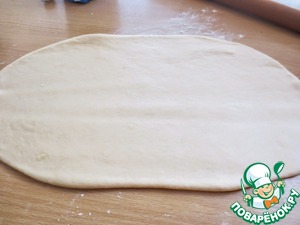 Стол присыпаем мукой и выкладываем тесто. Вымешиваем в течении 2-х минут, после этого оставляем тесто отдохнуть на 5 минут. Начинаем раскатку теста. Берем скалку и раскатываем пласт, толщиной 5 мм. -