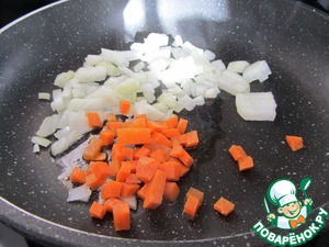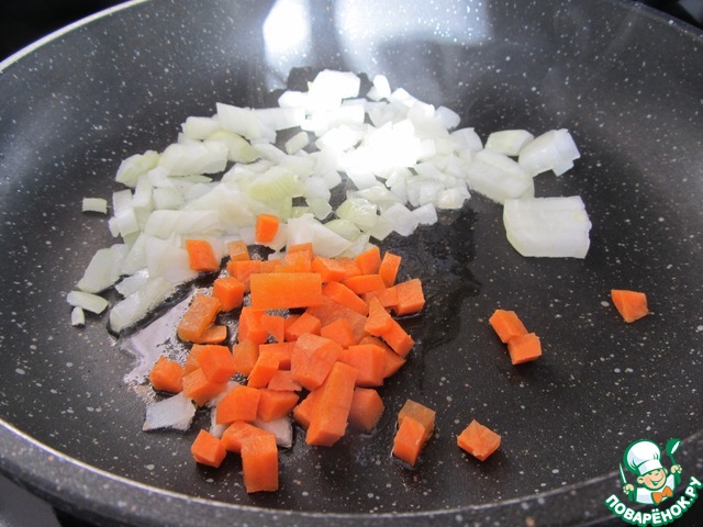 В это время нарезать лук мелкими кубиками и спассеровать на растительном масле. Морковь - не обязательно, но с ней суп выглядит наряднее. -