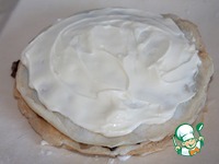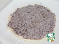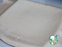 Слоенное дрожжевое тесто раскатываем. Часть отрезаем для украшения. Вытягиваем на тарелке или на столе.