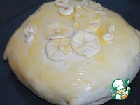 Украшаем по желанию. Смазываем желтком. Отправляем в разогретую до 180 - 190 град. духовку на 30 минут.
