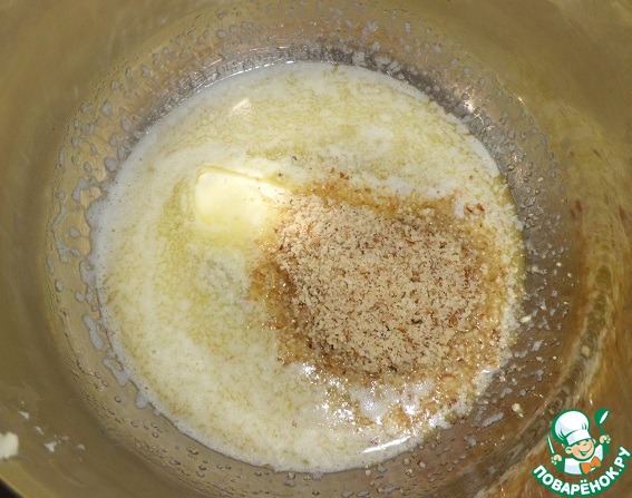 Сливочное масло растапливаем в небольшой кастрюльке, добавляем мелко порубленные грецкие орехи. Прогреваем.