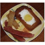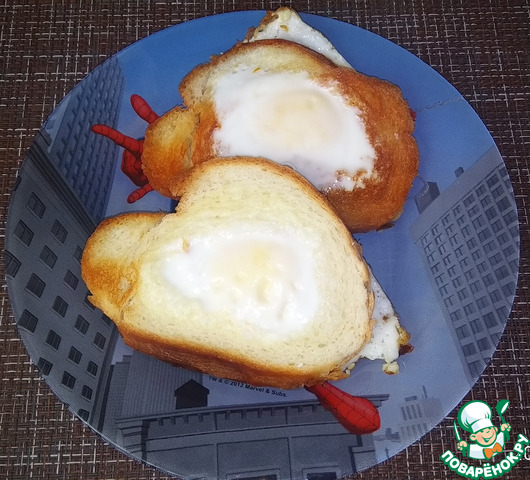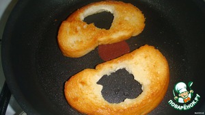 • Разрежьте батон на ломтики. С помощью формочки вырежьте в центре каждого ломтика какую-нибудь форму. Ломтики хлеба поджарьте аккуратно с одной стороны.