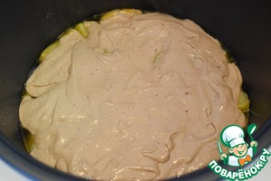 Выкладываем тесто на обжаренные яблоки, выбираем программу "Выпечка" и ждем окончания программы.