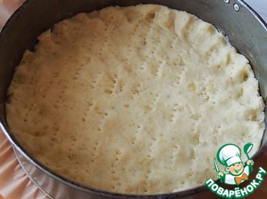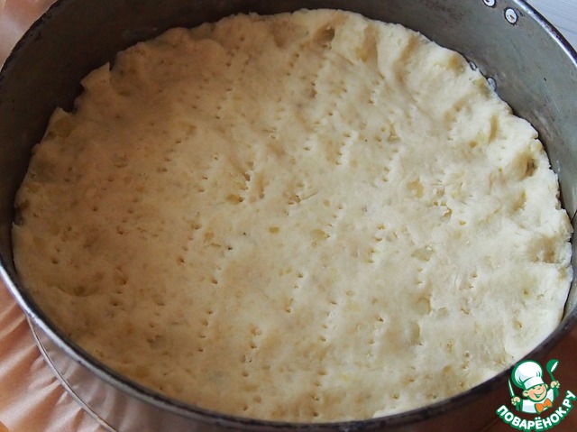 Тесто распределить по форме диаметром 20 см, наколоть вилкой и поставить в на 20 минут в духовку, разогретую до 200 градусов.