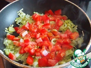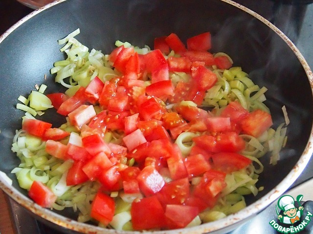 Пока тесто печется, нарезать лук-порей кольцами, из помидора удалить мякоть и нарезать его на кусочки, чеснок растереть в ступке или мелко порезать. Поджарить на сковороде с ложкой растительного масла в течение 5 минут.