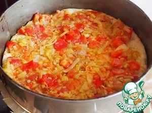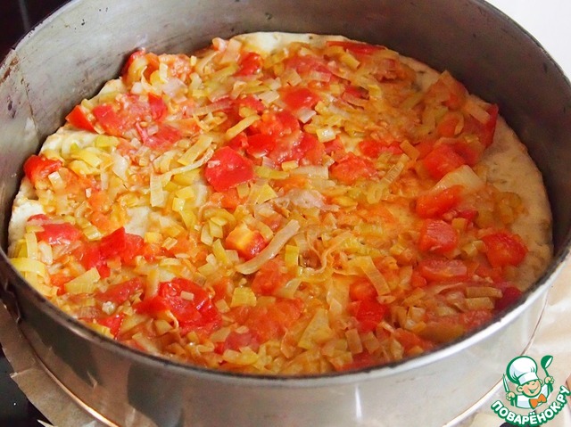 Достать тесто, положить на него поджаренные лук-порей с помидорами и чесноком.