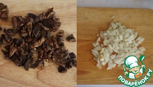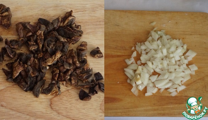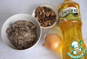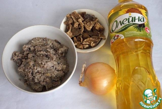 Здесь на фото продукты для начинки. У меня уже готовое фасолевое пюре, просто отварная фасоль измельчена блендером, нам нужен 1 стакан. Грибы я использую сухие, с ними получается ароматнее, но можно брать любые. Сухие грибы заливаю горячей водой и даю помокнуть 30 мин.