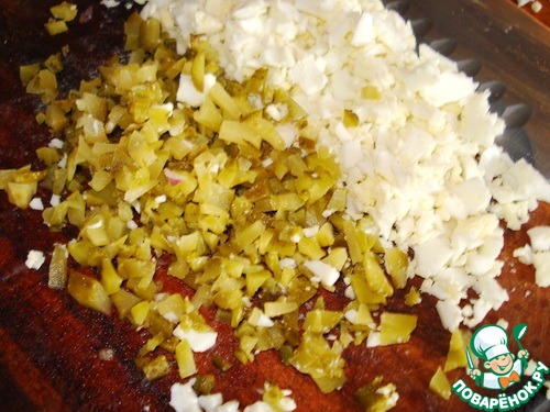 Огурцы, отварные яйца нарезаем небольшими кубиками.