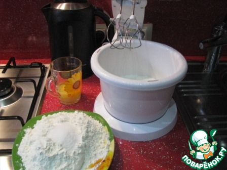 Отделяем желтки (4 яиц) от белков, в просеянную муку добавляем дрожжи, соль и сахар.