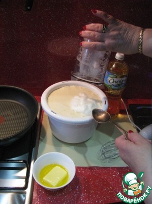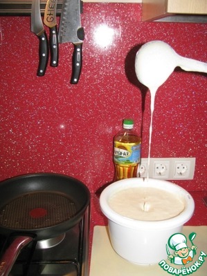 Перед каждым следующим блином тесто, перемешивая, поднимаем на высоту 30 см несколько раз, насыщая кислородом. Эту процедуру нужно проводить с любым тестом.