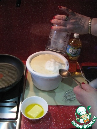 Взбиваем белки до густой пены, перемешиваем, добавляем 3 ст. ложки растительного масла "Олейна" и приступаем к выпечке блинов.