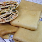 Воздушные дрожжевые блины с начинкой из печени трески, вареной моркови, зелени и яиц. Вкус приятно-солоноватый с рыбным оттенком.