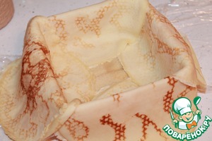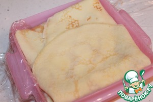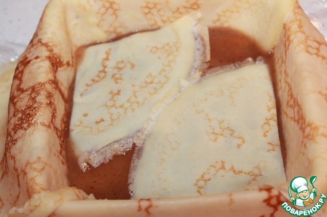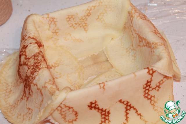 Квадратную или прямоугольную форму выстилаем пищевой пленкой, на дно кладем блинчик, по бокам также кладем блинчики. Оставляем свисающими края, чтобы потом можно было полностью закрыть форму.